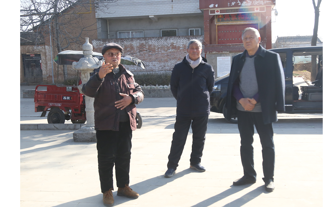 周三王庙广场上树立着三间四柱七楼大牌坊一座,2014年由常熟市吴姓人捐建,牌坊上撰联一副“纵穿历史三千载八骏跃岐阳,开创周基八百年三王名禹甸”在三王庙旁一小卖店里,我们有幸见到了三王庙的文保员杨水怀。康会长送上南阳特产---“南阳三宝”礼品,并介绍我们的来意后,杨水怀热情做向导,带领我们参观和讲解。